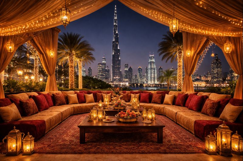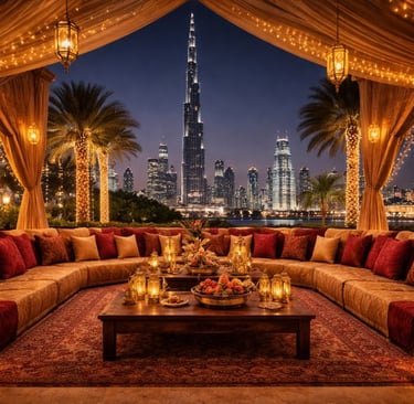 Traditional Majlis Tents: Designed to capture the essence of Emirati culture, these tents feature intricate Arabic patterns, elegant lighting, and plush seating arrangements.